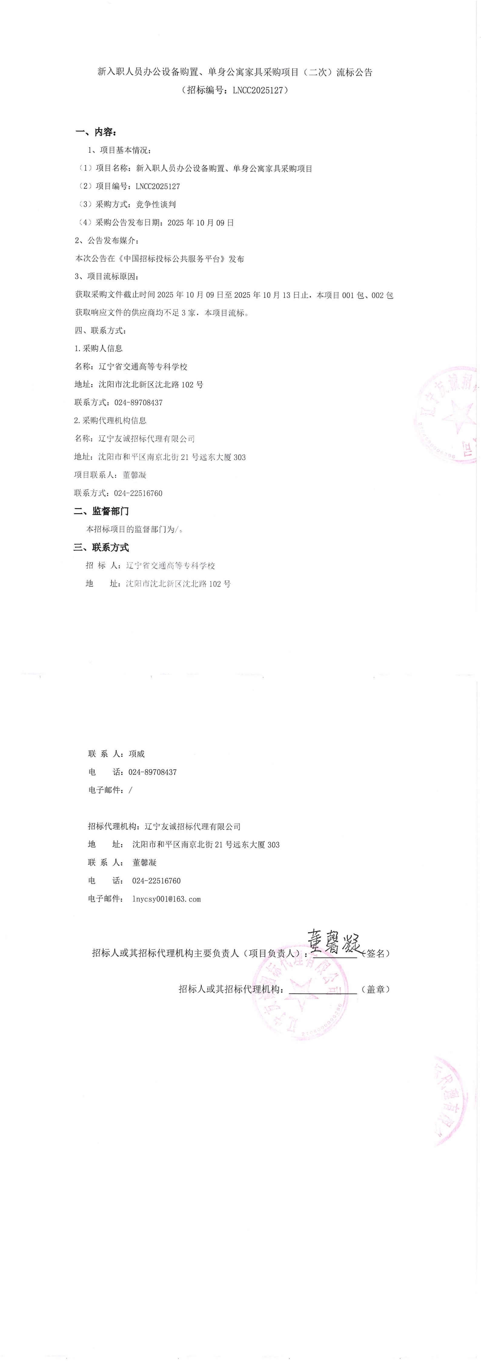 新入职人员办公设备购置、单身公寓家具采购项目(二次)流标公告