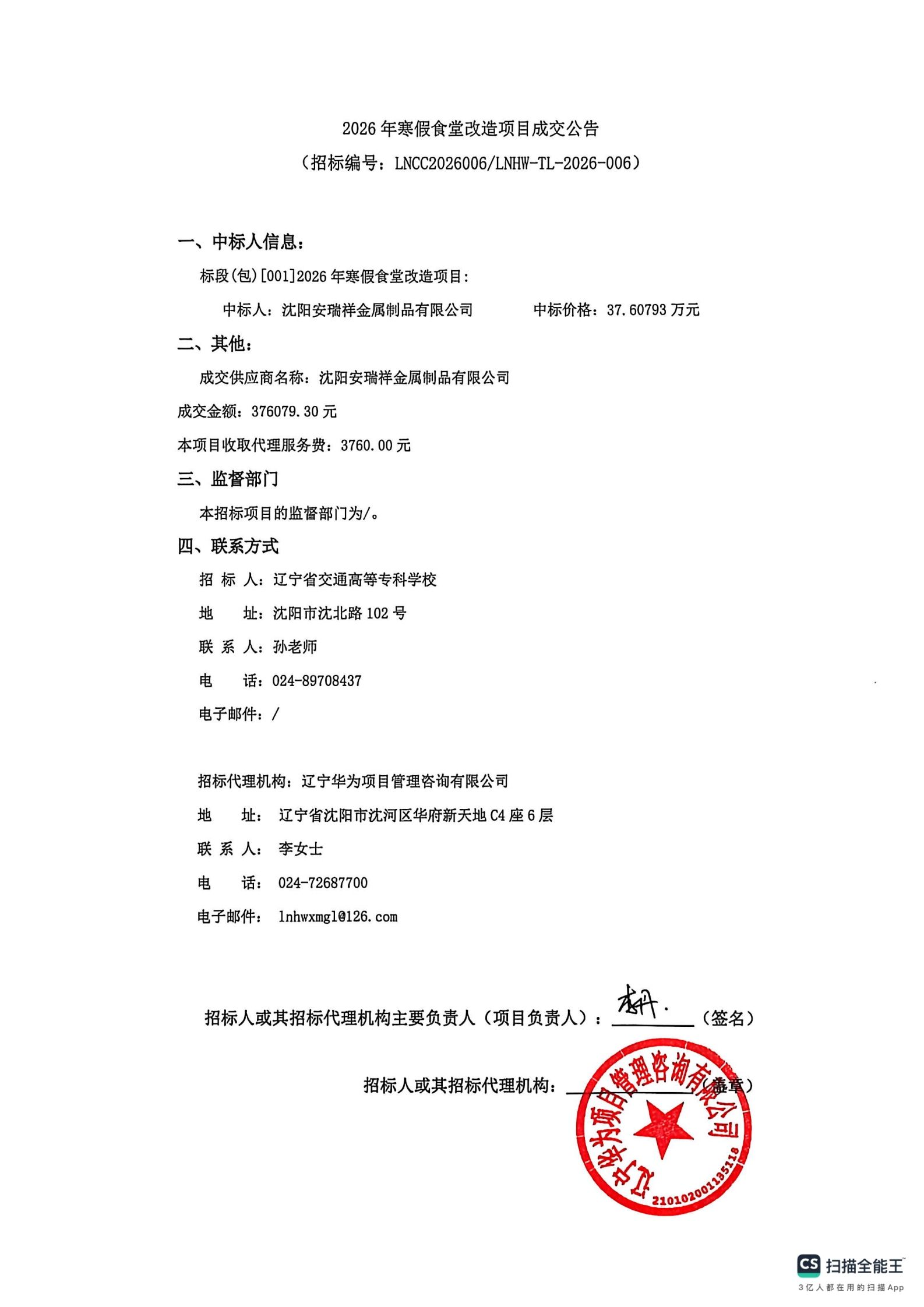 2026年寒假食堂改造项目成交公告(LNCC2026006)