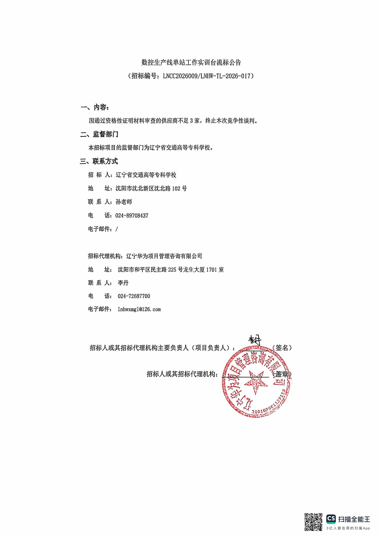数控生产线单站工作实训台采购结果公告(LNCC2026009)