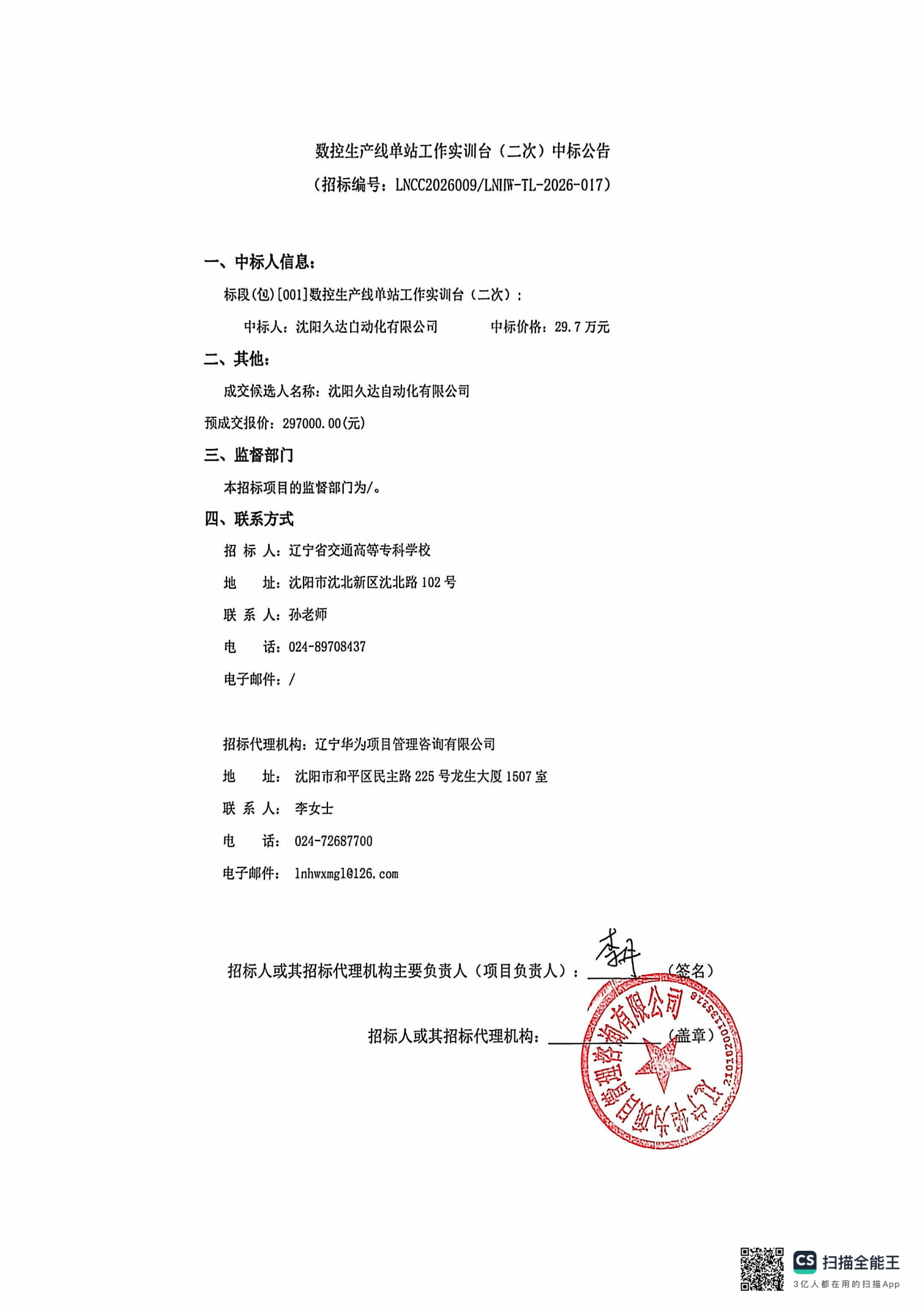 数控生产线单站工作实训台采购结果公告(LNCC2026009)