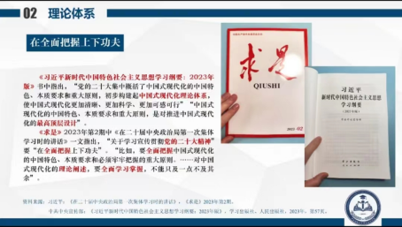 接着,龙光泽从中国式现代化的中国特色、本质要求和重大原则三个方面详细讲解中国式现代化理论体系。中国式现代化是人口规模巨大、全体人民共同富裕、物质文明和精神文明相协调、人与自然和谐共生、走和平发展道路的现代化。其本质要求是:坚持中国共产党领导,坚持中国特色社会主义,实现高质量发展,发展全过程人民民主,丰富人民精神世界,实现全体人民共同富裕。并且要把握中国式现代化的五个重大原则:一是坚持和加强党的全面领导,二是坚持中国特色社会主义道路,三是坚持以人民为中心的发展思想,四是坚持深化改革开放,五是坚持发扬斗争精神。