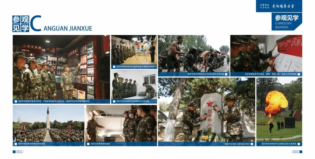 技能培养:根据岗位需求,从第二学期开始,每学期会给大家安排2-3门的课程综合实训。重点提升警士的摄影、摄像、军事展板设计、三维交互、网页设计、视频编辑等能力的提升。利用每年的暑假期间进行为期三周的军队实践,第五学期进行入伍分配及入伍训练,第六学期进行军队专业岗位实习。